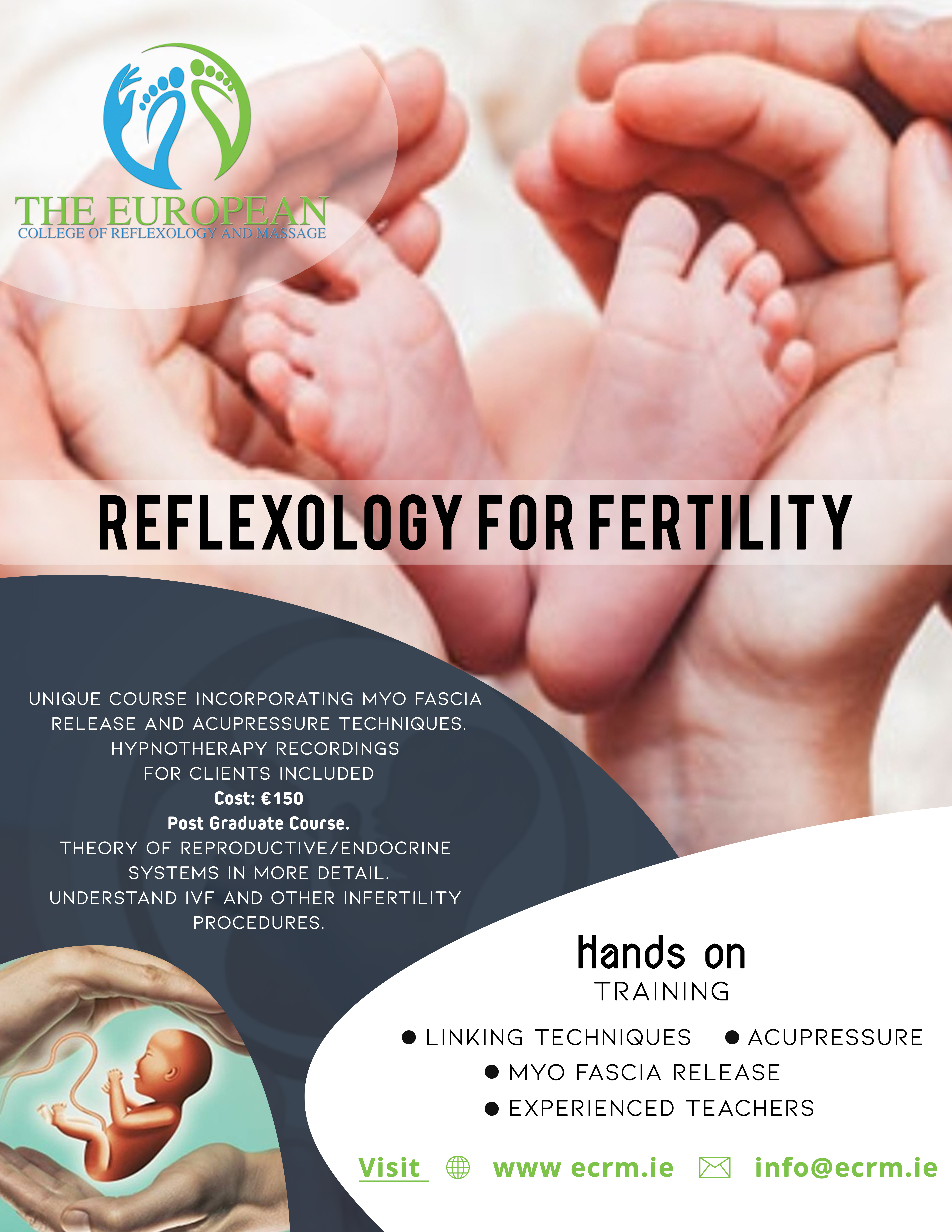 - Optional Hypnotherapy/meditation recording for fertility (for client to listen to in between and during reflexology sessions) recording is unique to ECRM and produced by college hypnotherapist and psychotherapist to help client overcome emotional barriers.